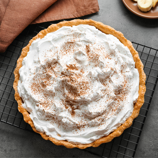 You'll find lots of fresh sliced bananas in our banana cream pie, topped with fresh whipped cream.