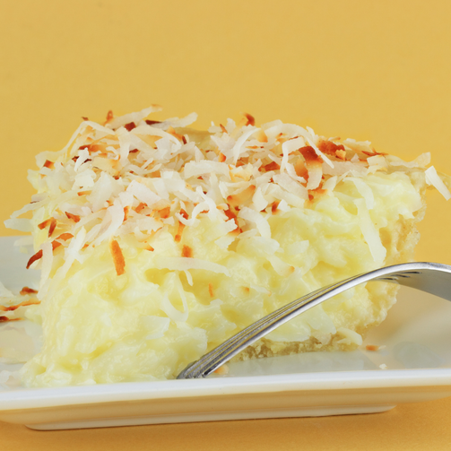 Coconut custard topped with fresh whipped cream and more toasted coconut.